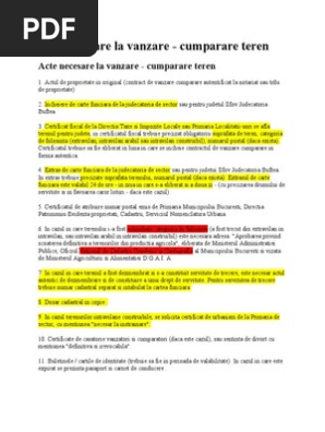 Iar la vânzarea unui astfel de teren sunt necesare anumite acte. Actul de proprietate pentru terenuri acesta poate fi contract de vanzare cumparare autentificat la notariat sau titlu de proprietate. Dacă terenul se obține printr un contract de vânzare cumpărare după ce cădeți de acord cu vânzătorul asupra diferitelor aspecte privind prețul modalitatea de efectuare a plății etc trebuie să vă prezentați în fața unui notar public pentru a legaliza contractul de vânzare cumpărare. Alocă ți timp pentru a merge la notar iar pentru a eficientiza tranzacția trebuie să existe la dosar și toate actele necesare.