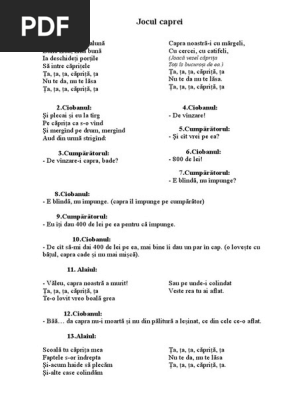 Ta ta ta caprita mea da diseara ce om manca. Ii manca ce s o intampla si te oi vinde n sadova si i manca cat ii manca pana burta ti o crapa. Bine i sade caprei mele cu hurmuz si cu margele frumoasa i caprita mea cu covor si cu basma. Vine capra de la munte cu steluta alba n frunte are n coarne ramuri multe si mai mari si mai marunte.