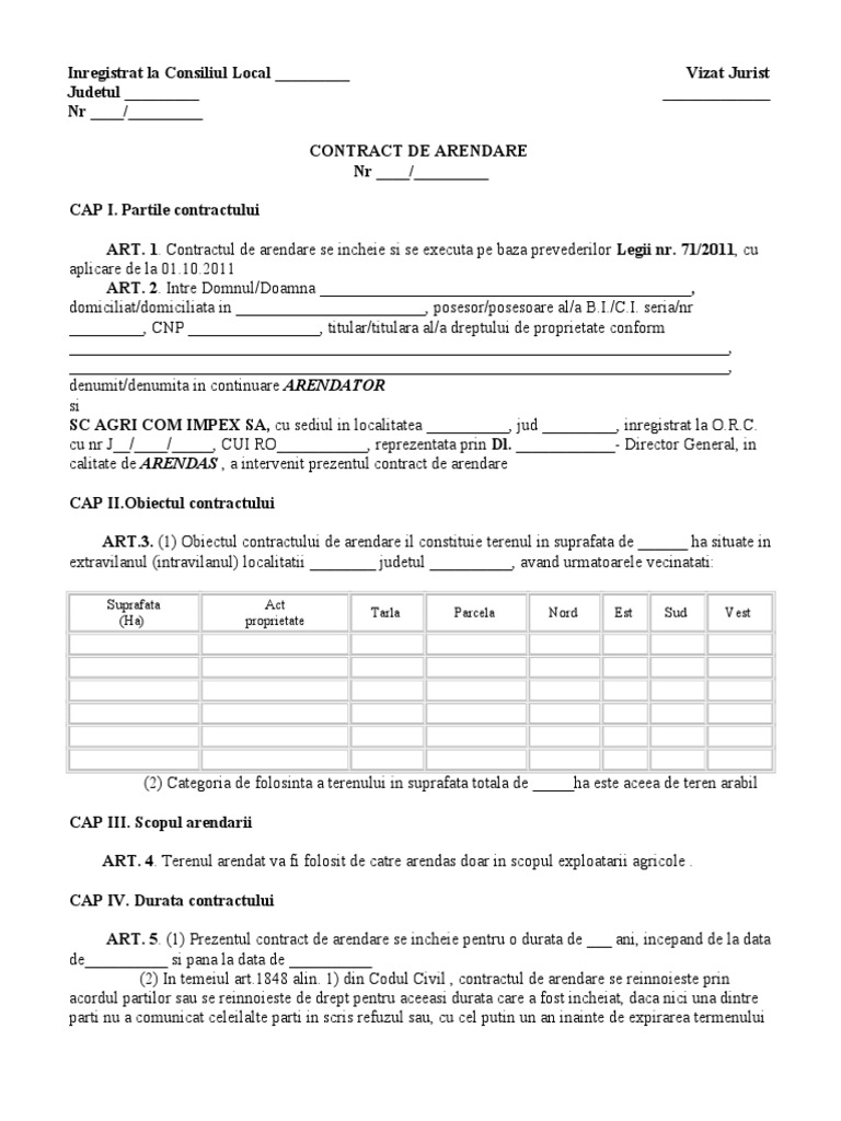 Atunci când arenda se plăteşte în fructe în lipsa altui termen prevăzut în contract arendaşul este de drept în întârziere pentru predarea lor de la data culegerii iar arendatorul este de drept în întârziere pentru recepţie de la data la care a fost notificat în scris de către arendaş. Contract de arendare model părţile contractului. Daca cititi cu atentie de la inceput pana la final acest contract este numai in folosul arendasilor. 9 1 în caz de neexecutare a obliga ţiilor prev ăzute în contract de c ătre una dintre p ărţi contractul se consider ă reziliat de drept.